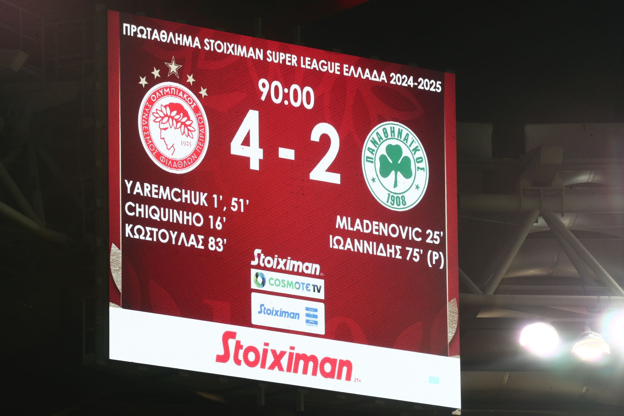 Νίκη του Ολυμπιακού με 4-2 επί του Παναθηναϊκού στο «Γ. Καραϊσκάκης», για την 1η αγωνιστική των Playoffs της Stoiximan Super League.